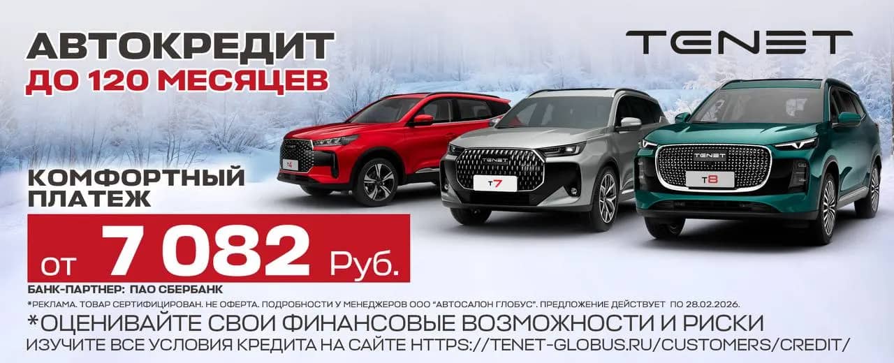 Кредит предоставляется Публичным акционерным обществом «Сбербанк России» (ПАО Сбербанк) (лицензия Центрального банка Российской Федерации на осуществление банковских операций от 11.08.2015 № 1481, ОГРН 1027700132195). Кредитная субпрограмма «Директ 0» кредитной программы «Директ» на новые автомобили TENET T4, TENET T7, TENET T8: диапазон значений полной стоимости кредита составляет в % годовых от 0.010 до 15.810; в рублях РФ от 5.31 до 12 721 924.67. Процентная ставка по кредиту 0,01% годовых устанавливается при следующих условиях кредитования: первоначальный взнос от 20% до 90% от стоимости автомобиля и дополнительного оборудования, сумма кредита от 100 000 руб. до 16 000 000 руб., срок кредитования от 12 до 96 мес. Обеспечением по кредиту является залог приобретаемого автомобиля. Неустойка – 20,00% годовых с суммы просроченного платежа за каждый день просрочки в соответствии с Общими условиями кредитования. Подробнее об условиях кредитования, требованиях к страхованию, к заемщику и к документам на www.sberbank.ru. Условия актуальны на 01.11.2025. Предложение носит информационный характер, не является публичной офертой. Банк вправе отказать в выдаче кредита.
